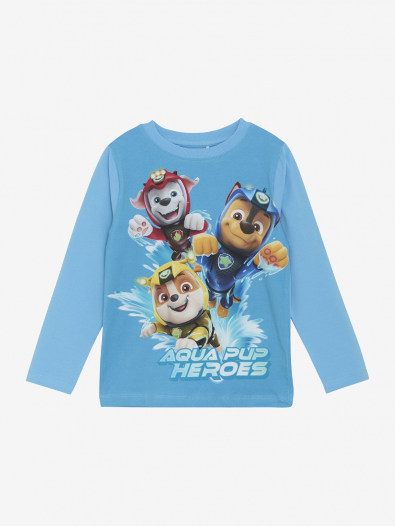Tričko s dlhým rukávom s potlačou Paw Patrol od Minymo. Tričko je vyrobené z jednoduchého džerseja z mäkkej bavlnenej zmesi a má rebrovaný výstrih pri krku. Tričko má vpredu veľkú potlač s nápismi Marshall, Chase, Rubble a "Aqua pup heroes".